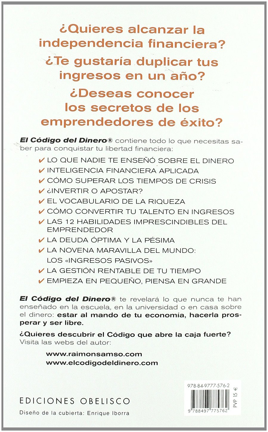 ¿Quieres alcanzar la independencia financiera? ¿Te gustaría duplicar tus ingresos en un año? ¿Deseas conocer los secretos de los emprendedores de éxito? El Código del Dinero® contiene todo lo que necesitas saber para conquistar tu libertad financiera: *LO QUE NADIE TE ENSEÑÓ SOBRE EL DINERO *INTELIGENCIA FINANCIERA APLICADA *CÓMO SUPERAR LOS TIEMPOS DE CRISIS *¿INVERTIR O APOSTAR? *EL VOCABULARIO DE LA RIQUEZA *CÓMO CONVERTIR TU TALENTO EN INGRESOS *LAS 10 HABILIDADES IMPRESCINDIBLES DEL EMPRENDEDOR *LA DEUDA ÓPTIMA Y LA PÉSIMA *LA NOVENA MARAVILLA DEL MUNDO: LOS INGRESOS PASIVOS *LA GESTIÓN RENTABLE DE TU TIEMPO *EMPIEZA EN PEQUEÑO, PIENSA EN GRANDE El Código del Dinero® te revelará lo que nunca te han enseñado en la escuela, en la universidad o en casa sobre el dinero: estar al mando de tu economía, hacerla prosperar y ser libre. Un libro muy oportuno en estos momentos de incertidumbre económica y precariedad. Un manual ameno, riguroso y práctico que más allá de los utilísimos consejos prácticos para sacar mayor partido de nuestros ahorros, nos muestra cómo el desapego y la libertad aportan abundancia y prosperidad de forma natural. Porque, como dice el sabio, "no es más rico quien más tiene, sino quien menos necesita". Raimon es un maestro en este sentido.